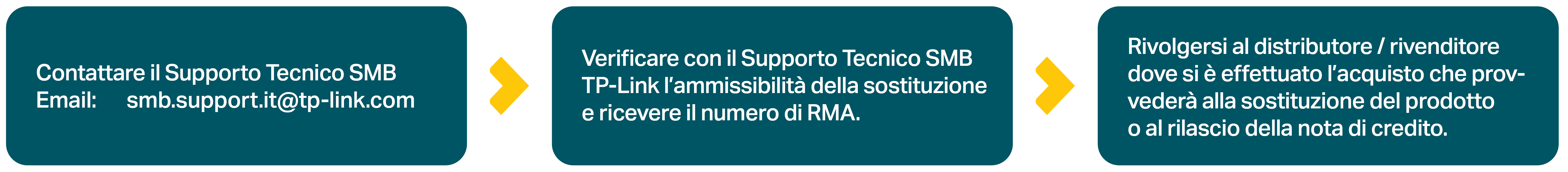 - Contattare il Servizio di Supporto Tecnico TP-Link Italia S.r.l. per verificare l’ammissibilità della sostituzione con Return Material Authorization (RMA) all’indirizzo: smb.support.it@tp-link.com