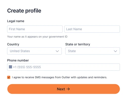 Outlier's onboarding process typically takes 30 to 90 minutes and includes creating your account, selecting your areas of expertise, completing skill screenings so we can match you with the right projects, and identity verification to ensure we're building a trusted community. Once you complete the general onboarding, you'll proceed to project-specific onboarding, which varies by project.