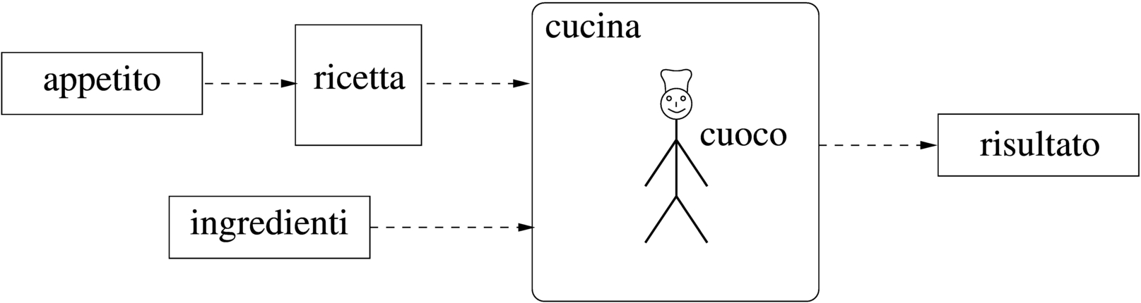 Per comprendere la struttura di un elaboratore si può immaginare il comportamento di un cuoco nella sua cucina. Il cuoco prepara delle pietanze, o piatti, che gli sono stati ordinati, basandosi sulle indicazioni delle ricette corrispondenti. Le ordinazioni vengono effettuate dai clienti che si rivolgono al cuoco perché hanno appetito.