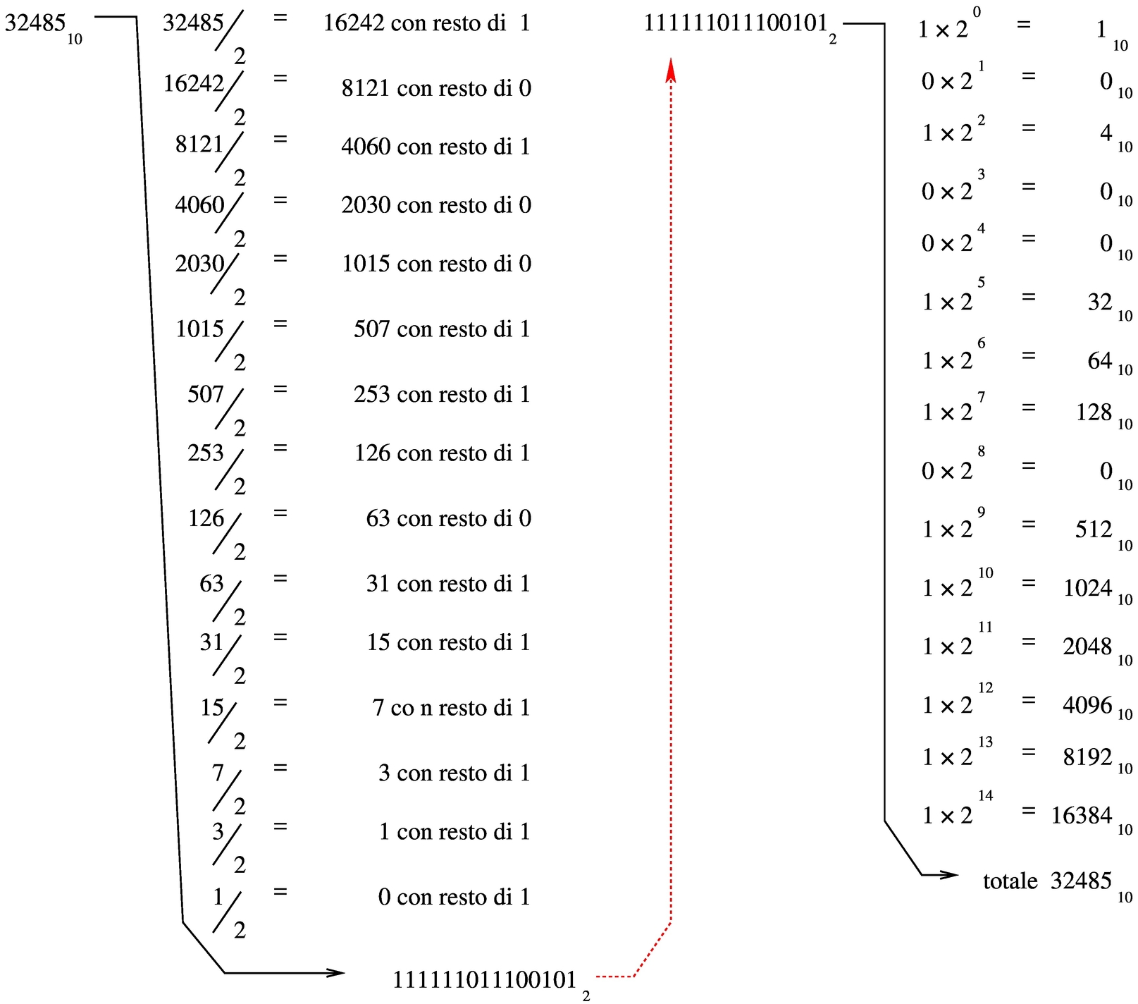 Per trovare il corrispondente binario di un numero in base 10, basta sottrarre sempre il valore più grande possibile. Supponendo di voler convertire il numero 123 in binario, si possono sottrarre i valori: 64, 32, 16, 8, 2 e 1: