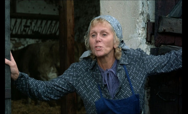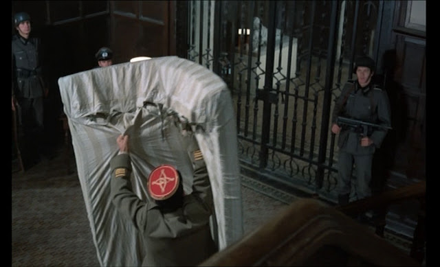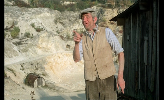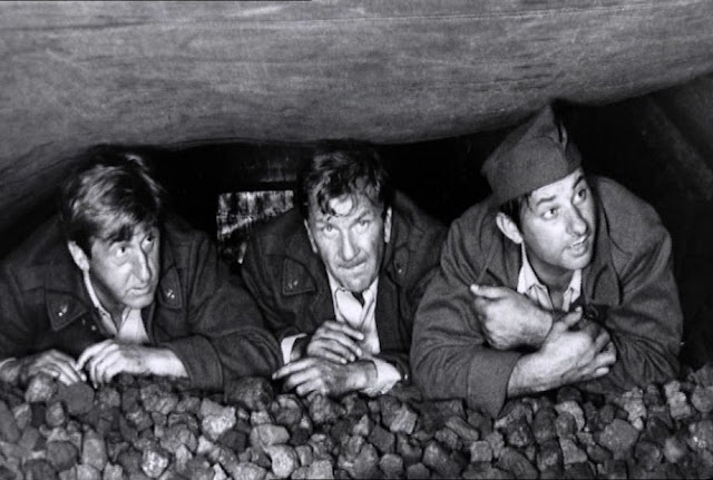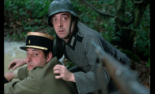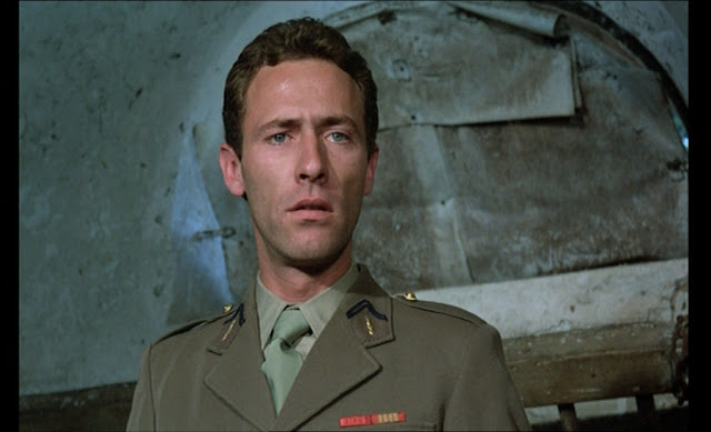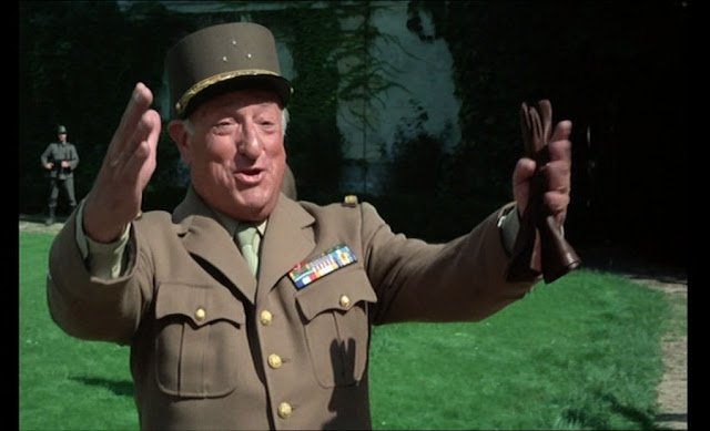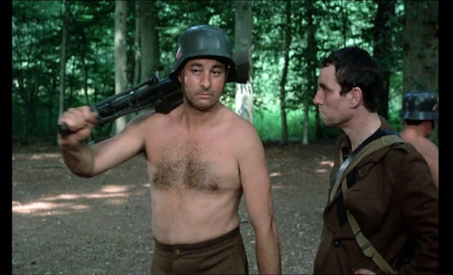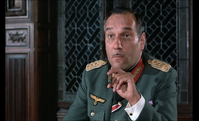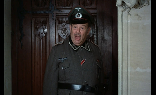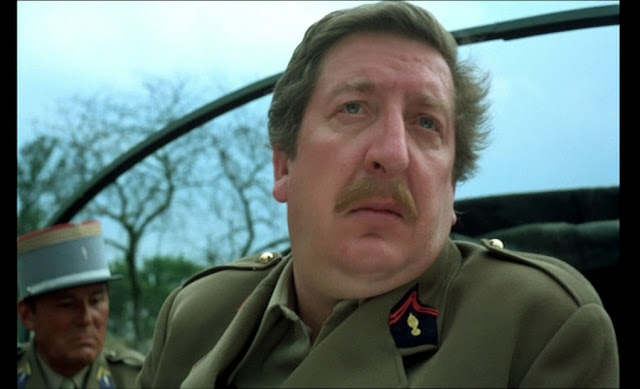 Un autre comédien que j'aime beaucoup est un de ces acteurs qui excellent à mettre en valeur leur physique peu commun. Jean Rougerie a une tête étrange, un regard à nulle autre pareille, difficilement descriptible, proche de l'animal mais l'on ne saurait dire lequel et puis surtout, il a une voix et une prononciation très particulière, trainante, sifflante, presque zozozante. Certes, dans ce rôle d'officier allemand, il ne s'exerce guère à nous faire la démonstration de son art déclamatoire. Il expulse l'air, il hurle, parle sec mai son air ahuri et froid fonctionne parfaitement pour le rôle.