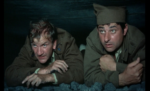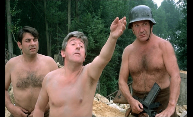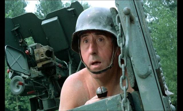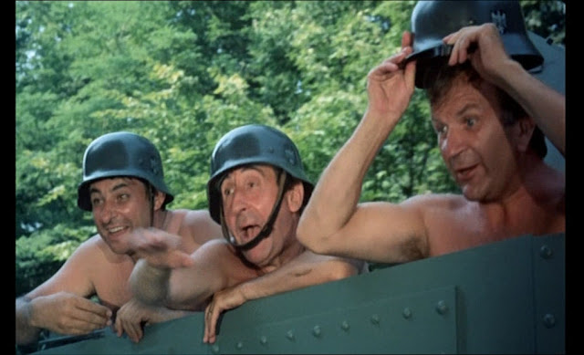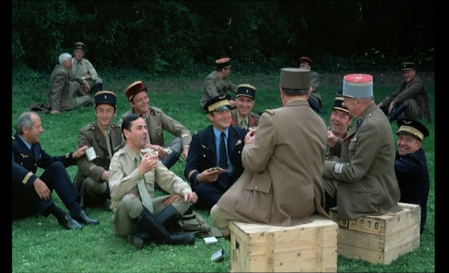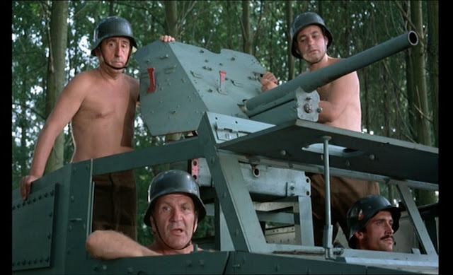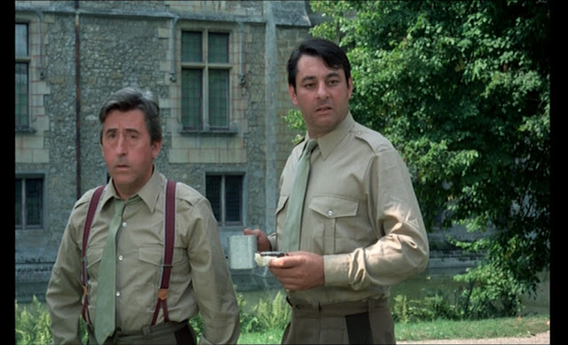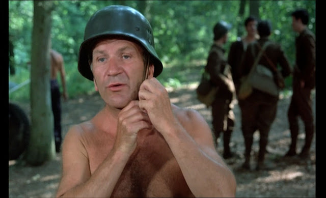 laisse ses hommes sur le bord d'une route de campagne, emmené dans un camion allemand avec d'autres officiers. Son regard est perdu dans de tristes pensées. On y sent toute l'amertume d'avoir perdu la guerre, le lourd sentiment de culpabilité, celle d'être responsable de cette débâcle et surtout d'abandonner des hommes qui comptaient sur lui. Au milieu de cette comédie bête et gentille, surgit donc une scène presque mélodramatique, bref instant de mélancolie, surprenante respiration, n'est-ce pas? Dans "Mais où est donc passée la 7e cie?" on avait eu droit, au moment où Tornade comprenait que lui et ses hommes étaient capturés, à un très gros plan où ses yeux exprimaient à peu près la même désillusion. On peut s'interroger sur cette récurrence entre les deux films. Pourquoi Robert Lamoureux a-t-il tenu à filmer ces moments si maussades au sein de ces insouciances affichées? La blague de potache est-elle issue d'un réel traumatisme? Est-ce que derrière le rire se cache une vraie blessure, ce sentiment national bafoué ou une histoire plus personnelle? Quoiqu'il en soit, je pense que Pierre Tornade incarne le sérieux de la guerre, une sorte de virgule qui permet à Lamoureux de rester proche de la réalité sordide de la guerre afin de ne pas laisser le film lui échapper.
