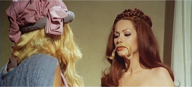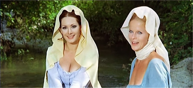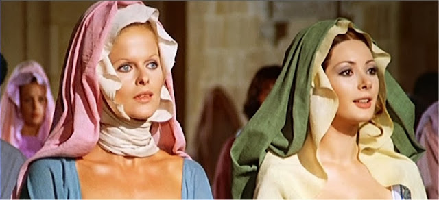 Malgré la médiocrité de la mise en scène, on sent tout de même que quelques moyens ont été mis en place sur cette production. Certes, l'éclairage n'est pas toujours discret en extérieur, mais la photographie est plutôt bonne dans l'ensemble. Colorée et précise, elle rend souvent hommage à la beauté de ces dames (nous y reviendrons, z'inquiétez pas). D'autre part, on a pris soin d'utiliser de réels décors moyenâgeux et on a essayé de coller au plus près de la réalité des costumes de l'époque. Dans le genre on a connu bien pire : ce film a de la tenue en fin de compte.