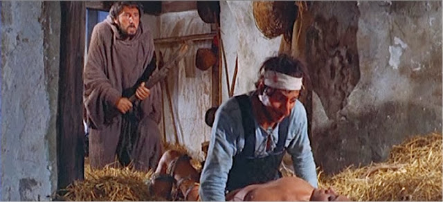 Et encore une fois, la comédie érotique italienne me laisse pantois : à qui peut bien se destiner ce genre de production ? L'humour y est clairement enfantin : un tabac dans les cours de récré ! Mais le reste est tout aussi nettement à destination des adultes. L'aspect rabelaisien du film est clair. On y loue les charmes de superbes donzelles, de la boustifaille ou des plaisirs champêtres. On y vante même l'hypocrisie des hommes : le moine qui purifie ses ouailles, à coups de bâton pour les hommes, à coups de bistouquette pour les dames ; l'adultère et la jalousie y sont dépeints comme consubstantiels à la conjugalité. Le film renifle évidemment du côté des auteurs médiévaux et modernes qui ont chanté la chair. J'ai cité en bon franchouillard Rabelais, mais l'Italie a son Boccace qui lui aussi a fouillé dans sa civilisation les secrets d'alcôve ainsi que ceux des latrines. Aussi le film traîne-t-il sous les lits, dans les buissons et jusque dans les égouts.