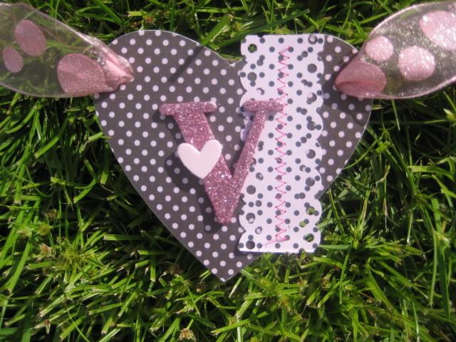 First up, I made a fun "Love" Banner...each little heart has some some of different scallop decoration...and the ribbon I used to string it up with has glitter polka dots, which really adds to the whole polka dot emphasis! =)