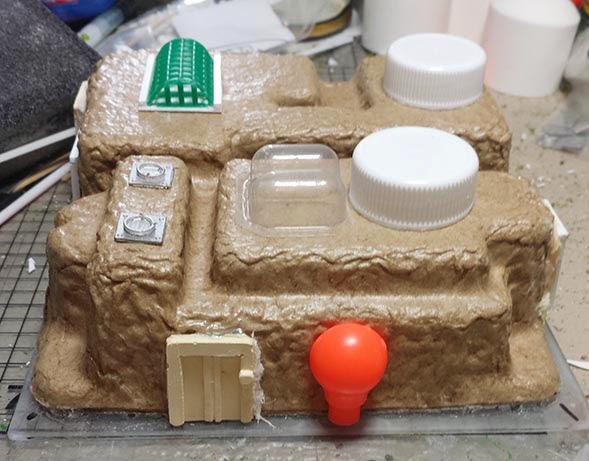 We seem to keep a lot of those paper mache packing containers. I am not sure why we do. I blame my wife, who can't seem to throw anything out. I don't really know what they are officially called, but those are the things that a lot of electronic devices are stuck into to keep them from banging around and getting damaged. The one I picked jumped out at me as a good candidate. It looked like a dwelling or research station made of some sort of earthen structure such as adobe. Maybe its a homestead on a backwater planet.