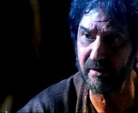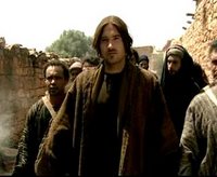 The Passion of the Christ, Jesus and his disciples speak in Aramaic. The portrayal of Jesus here is fairly unusual. Firstly, the actor playing him (George Calil) is half Lebanese. Furthermore, Jesus’s hair is fairly short (although, curiously not as short as the previous documentary by these film-makers suggested it should have been), and he wears stubble rather than a beard. As this footage unfolds we also see that this Jesus is a man of action. He is strong, well built, and acts with confidence and purpose.