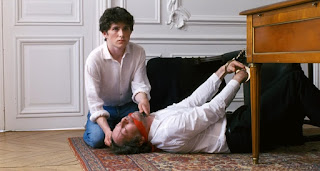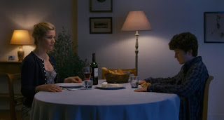 Then there are all the small almost incidental references the film makes. Most obviously in this respect is the naming of Vincent's mother as Marie and of his "adopted" father Joseph. But many more exist far more fleetingly. Early on a shop banner reveals its name to be Pere & Fils, Orfraie's book is called "The Predatory Mother". Then there's the way that when Vincent first spots Pormenor he is wearing a red scarf and later on in the film Vincent mirrors that by wearing one himself. In a later scene Green captures a two shot of Vincent and Joseph both with the sweater tied around their neck in identical ways (above) - they are a mirror image, but together and now united on the same size.