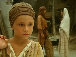 The other element of Jesus ministry that is foreshadowed here is his supposed rejection of some of the established areas of Jewish practice. At one point surprised at the complexities of lighting a lamp in the correct way he says "If lighting a lamp is complicated it would be easier if people would sit under the moon". Shortly afterwards we see him sizing up a money-changer, as if already wise to the possibility that he might be shortchanging his customers. Most strikingly, when Joseph suggests buying a dove to sacrifice in the temple Jesus objects, saying "but doesn't Almighty God prefer to hear his birds alive, greeting the morning?" What's clear is that Jesus is a strongly opinionated child, who, at least initially, his mother is finds a little troublesome. Gradually through the course of the film she stops chiding him and starts listening and respecting him.
