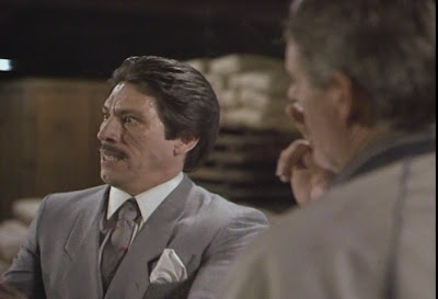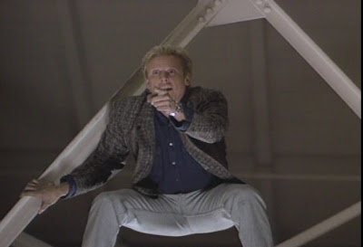Instead of calling for back-up, McBain decides to sneak into the warehouse and handle things on his own. And by "sneak," I of course mean "take absolutely no cover in the rafters of the building." A firefight ensues, one that features a lot of bad guys shooting automatic weapons and not hitting anything. On the bright side, McBain kills someone every time he fires his revolver. Over the next few minutes, the following things happen: