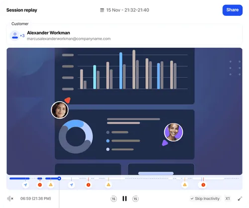 Watch the session replay to understand the issue. If the customer needs live help, jump into a cobrowsing session from the same platform. No stitching together separate tools.