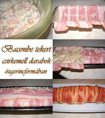 Hozzávalók: kb. 60 dkg csirkemell, 20 dkg szeletelt bacon, kis petrezselyem, só, bors, 4 evőkanál tejföl, 15 dkg reszelt sajt, 3 evőkanál liszt, 2 db tojás, egy kis zsemlemorzsa és margarin az őzgerincforma kikenéséhez