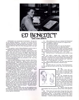 http://arglebarglin.blogspot.com/2006/06/john-k-on-ed-b.htmlI have lots of interviews with classic animators and directors on tape. They were all transcribed at one time but got eaten by old computers and formats that died. Now they need to be retranscribed all over again. Jeezus.If you ever find the