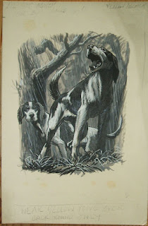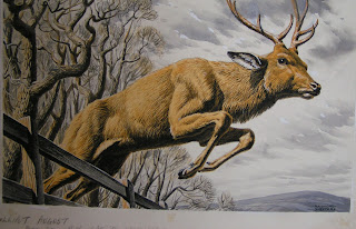 "job is to find, through pure woodcraft and the knowledge absorbed in the thirty-six years he has worked for the Hunt, a warrantable stag for hounds next morning". The original art is still around, and shows a gorgeous stag jumping a fence.