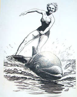 In the July edition 1955, Lilliput had a small illustration accompanying a book review section (called "Animal Crackers") which you'd hardly recognise as Sheppard's work unless you knew the original art is in Christine Sheppard's possession - that's provenance for you! The book it accompanies is called Psychology of animals in zoos and circuses by Dr. H. Hediger and shows Flippy the dolphin whose talent is towing "a surfboard of bathing belle".