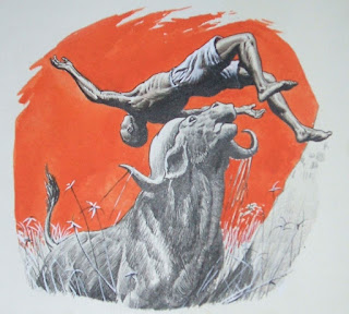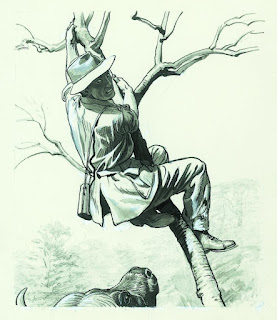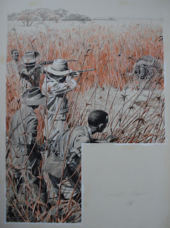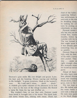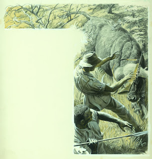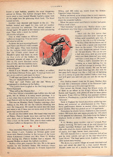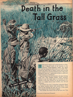The January edition contained a story by Sandy Sanderson called "Death in the tall grass" and concerns an attack by a water buffalo on men in 8 foot elephant grass in the Sudan. Despite my best efforts all I can tell you about Sandy Sanderson is he wrote quite a few stories in Lilliput (two of which were illustrated by Sheppard - and one by Frank Bellamy). He also wrote articles in Collier's, Cavalier and True magazines which might imply he was American. Unfortunately the surname 'Sanderson' often leads to the nickname 'Sandy'! However in Chris Harte's - mostly - excellent "Lilliput Magazine: A history and bibliography" we have a single line in the author entry that tells us he was Harold Sanderson (1931-1993) -is this reference to the same man?