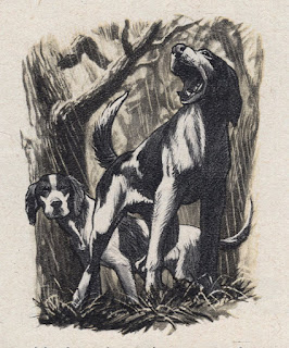Lilliput had an article, "Master of the Mountains" written by Malcolm Monteith with a lovely image of a fox drawn by Sheppard - unfortunately being chased by the hunting pack of dogs. But the background is all there in detail. Further in the article we have a spot illustration for the centre of the page of the hounds.