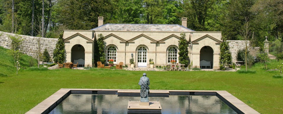 William Kent's Praeneste at Rousham in Oxfordshire was given as the inspiration for the new Pavilion. A seated statue of the influential philosopher Immanuel Kant is placed in the ornamental pool.