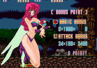 Despite the seemingly cutesy theme, Cotton doesn’t rely on pastel graphics and goofy boss characters like Parodius – this game is downright dark, as Cotton flies through dank caves, flaming volcanoes, and gothic castles. There are some weird boss characters too, including a cloaked skeleton, a Cleopatra statue with a lion head in its stomach, and a plant creature with one ugly face.