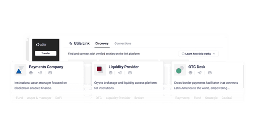Tap into a growing ecosystem of fintechs, payment firms, treasuries, yield and liquidity providers on Utila Link. Discover and connect with global counterparties to unlock new business opportunities and expand into new markets.