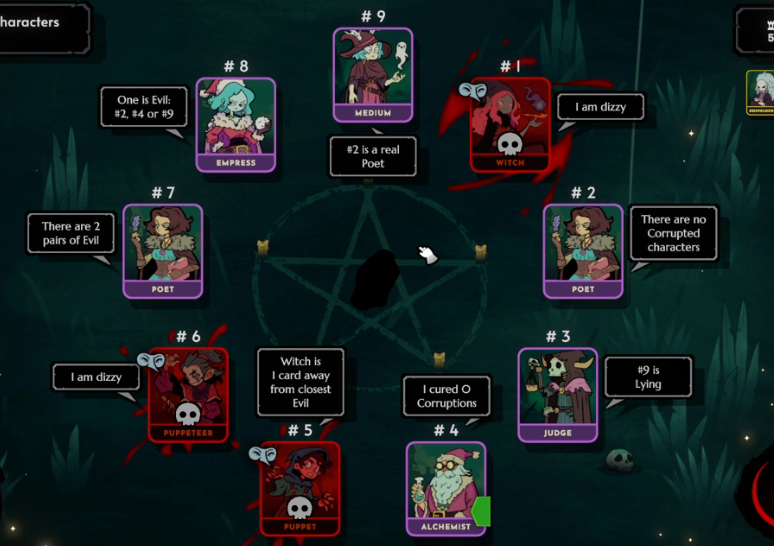 I dont have any way to get a full screenshot of this but from what i remember #9 was the demon but it still doesnt make sense for the puppet to lie since puppeteer should be the closest evil and witch should be the 2nd closest