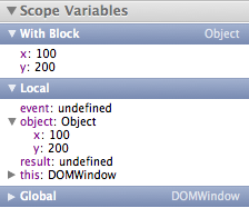 The Web inspector has a unique feature regarding in-scope variables: it shows closures, “with” statements, and event-related scope objects separately. This gives you a clearer picture of where your variables are coming from and why things might be breaking (or even working correctly by accident).