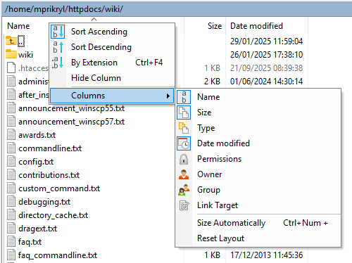 For example, see context menu of column header of remote file panel: