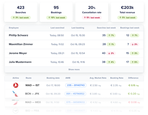 Easily review past quotations to improve conversion. Benchmark your procurement performance against the market and identify optimization opportunities. Know what’s going on anywhere, at any time, with user-level search and booking data. All with zero IT investment.