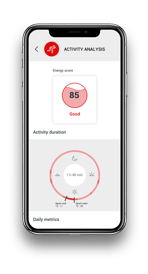 The Energy score is the ultimate score that tells you how much energy you have accumulated for the day. It is made up of many night and day markers so that you can evaluate your vitality and know every morning if you can surpass yourself or if you may avoid intensive activities and focus on rest.