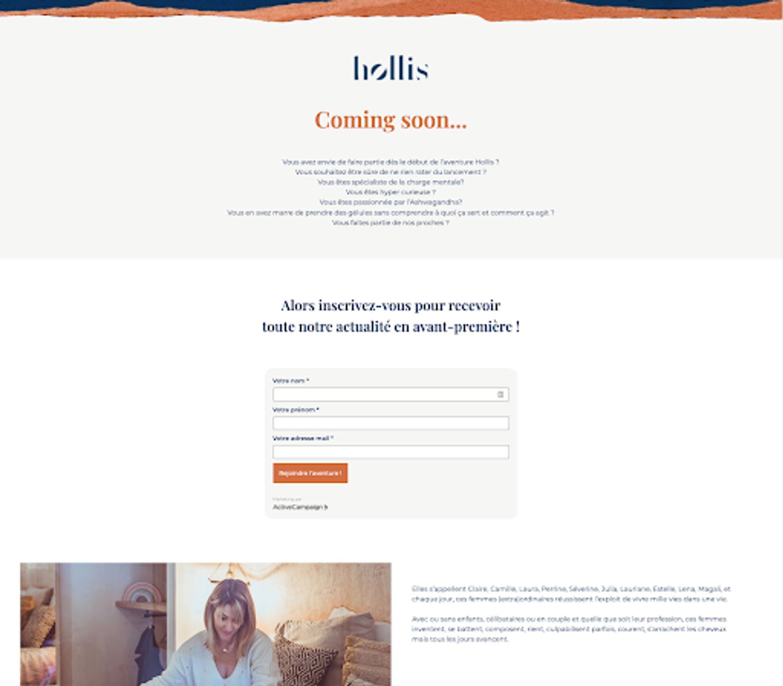 Elle a donc utilisé l’outil de page de renvoi d’ActiveCampaign, afin que les contacts puissent recevoir les mises à jour et rester au courant de l’évolution de Hollis, avant même que l’entreprise ne soit entrée sur le marché. Grâce à Pages, Mathilde a pu rapidement bénéficier d’une page de renvoi élégante et unique à sa marque, en l’espace de quelques clics.