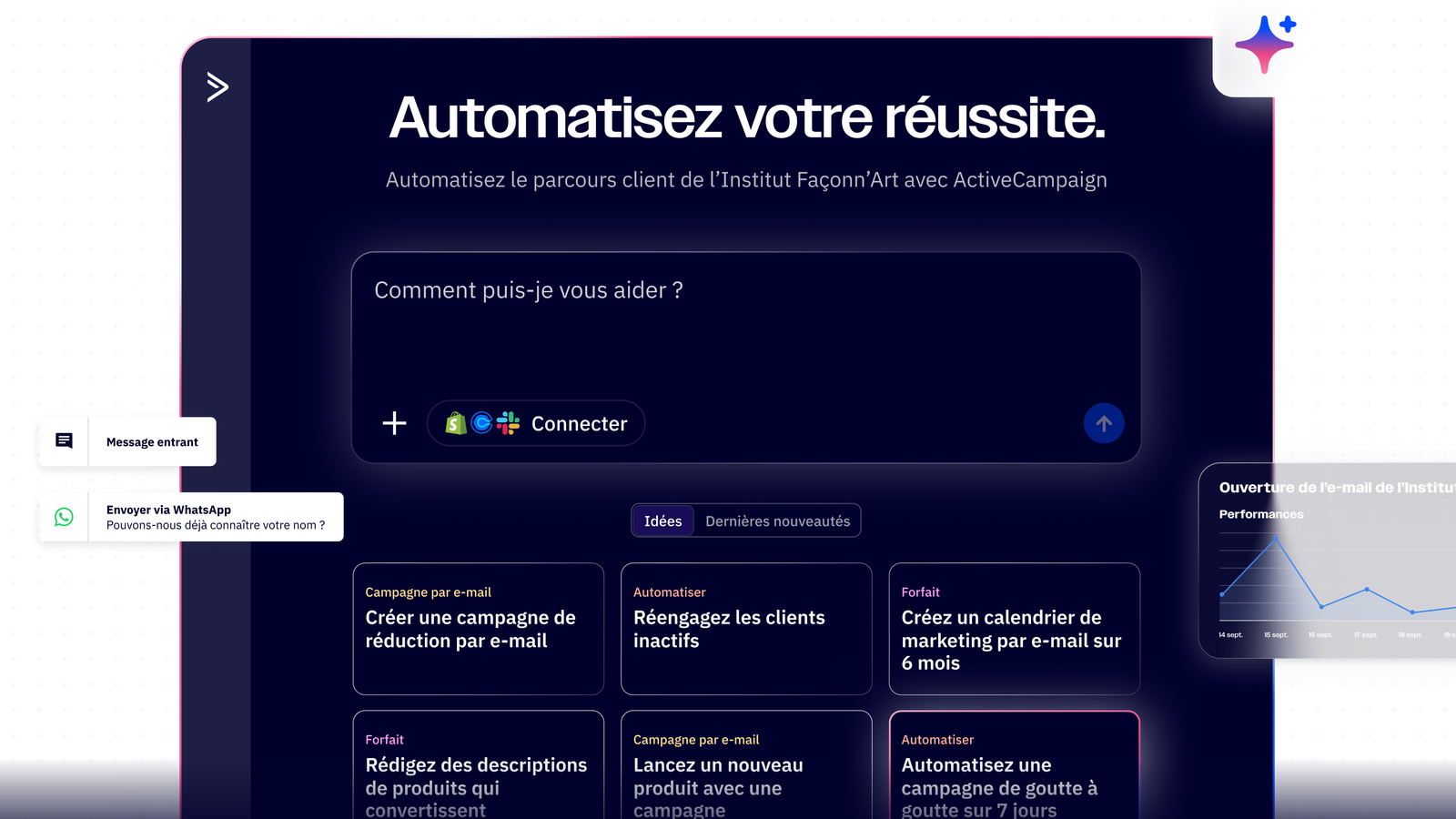 Demandez à l’IA quelles sont vos opportunités avec le plus d’impact dans vos initiatives marketing. Vos agents fourniront instantanément une réponse pensée pour vous mener au succès.