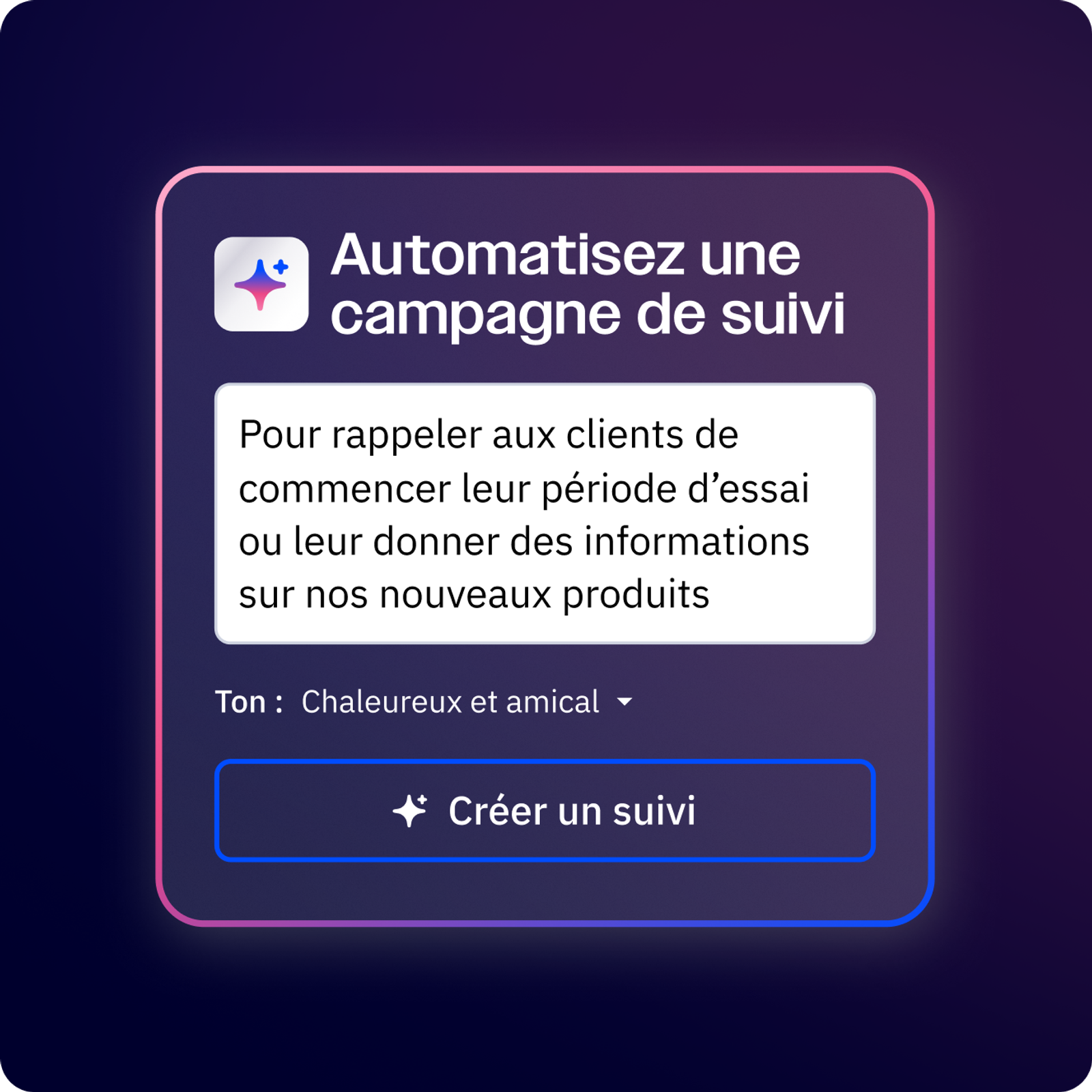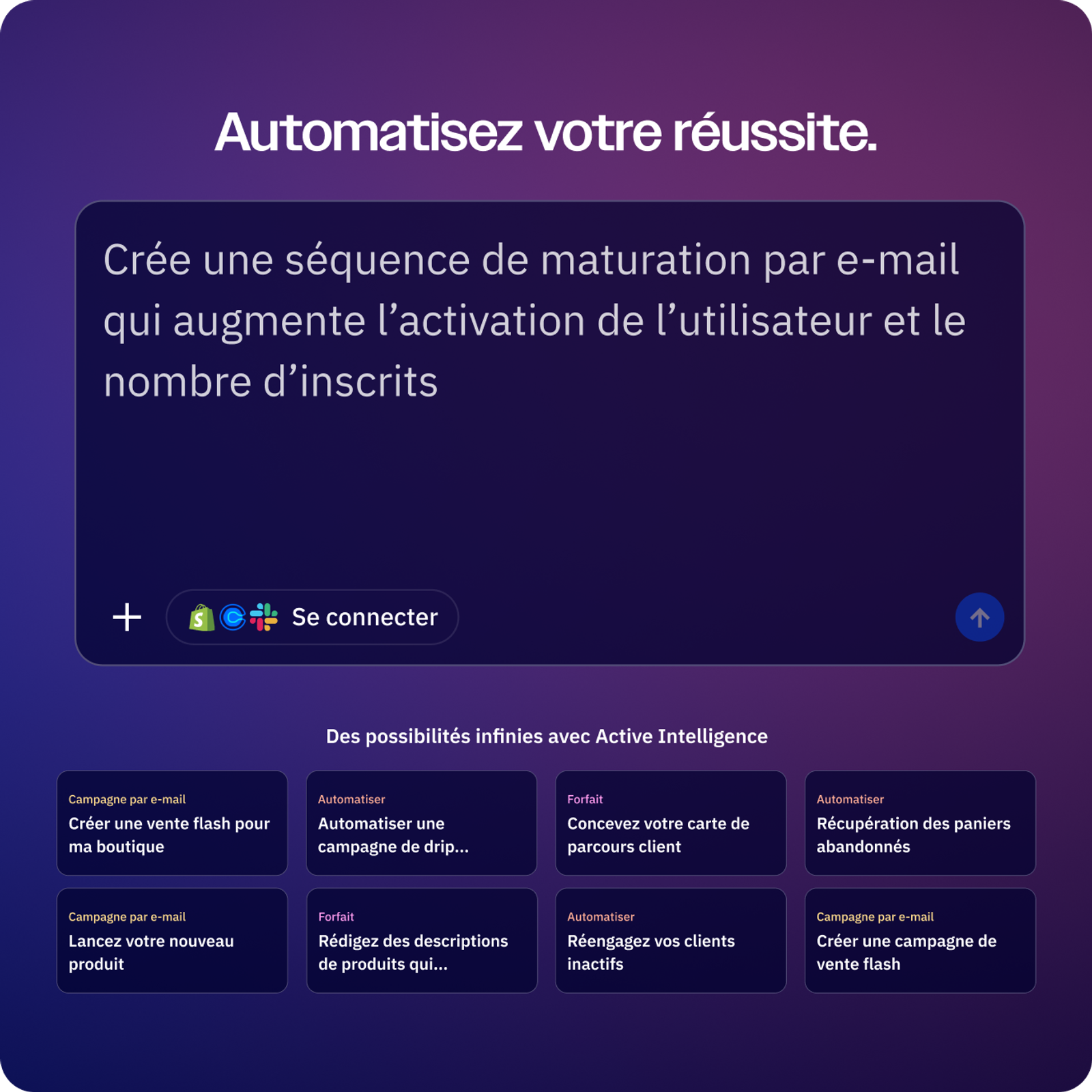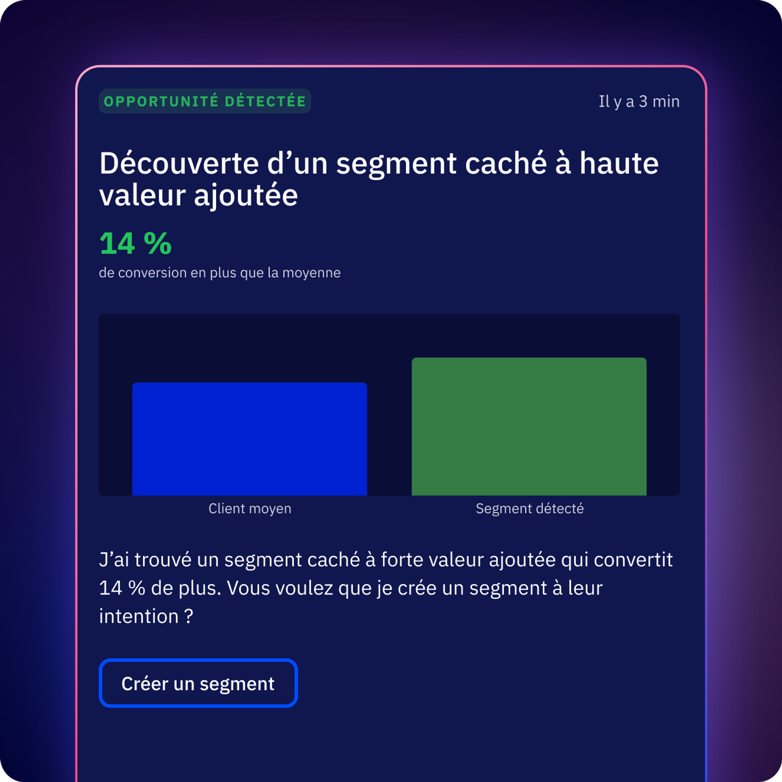 Nos agents IA sont conçus pour gérer votre marketing de manière autonome, de la création de contenu à la segmentation en passant par l’automatisation et la génération de rapports en temps réel. Chacun d’entre eux est concentré, personnalisable et prêt à faire évoluer ce qui fonctionne sur tous les canaux.