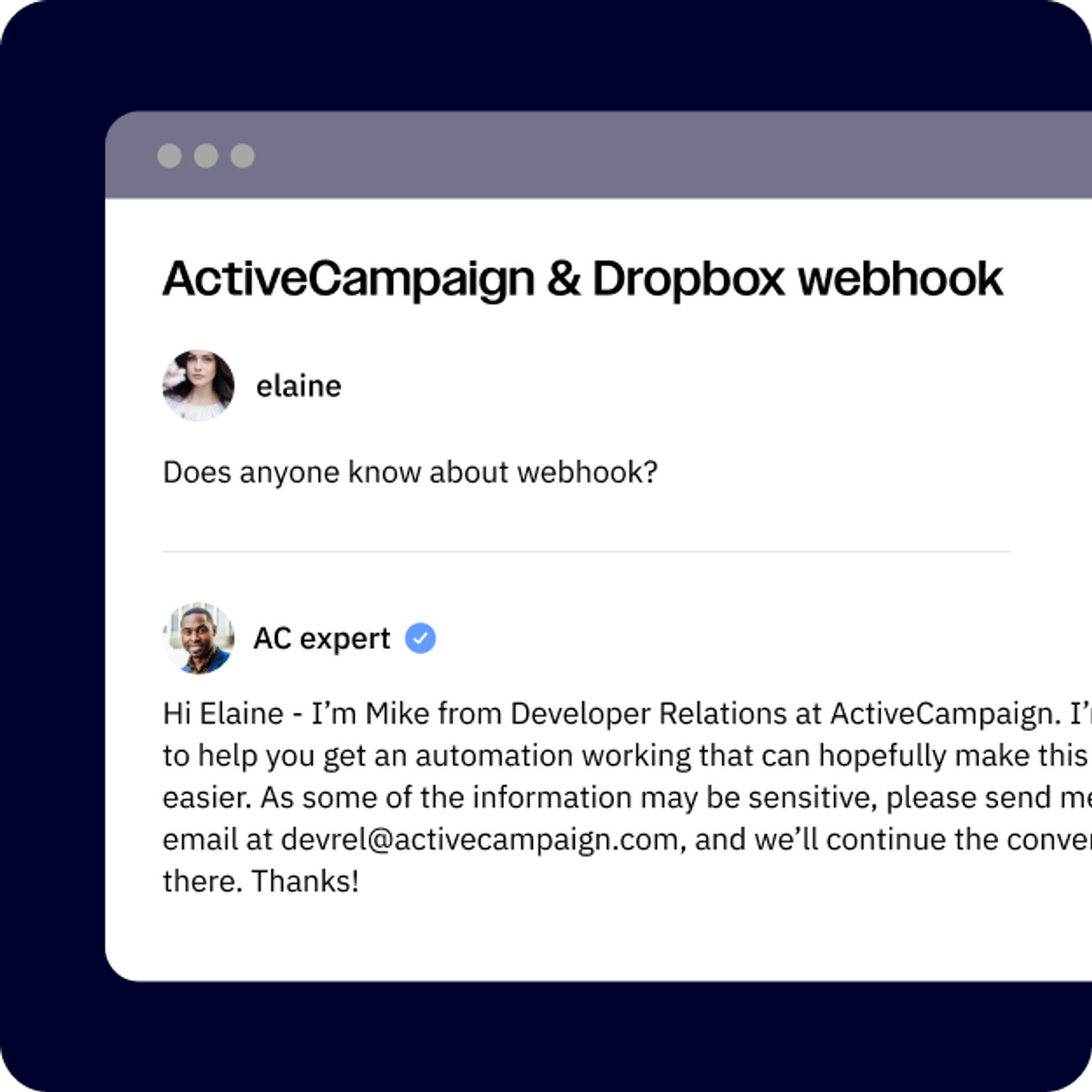 Get direct access to ActiveCampaign’s product teams and leadership. Your feedback shapes our platform's evolution through feature requests and beta testing opportunities that help us always improve, and give you first-hand experience with the latest AI tools.