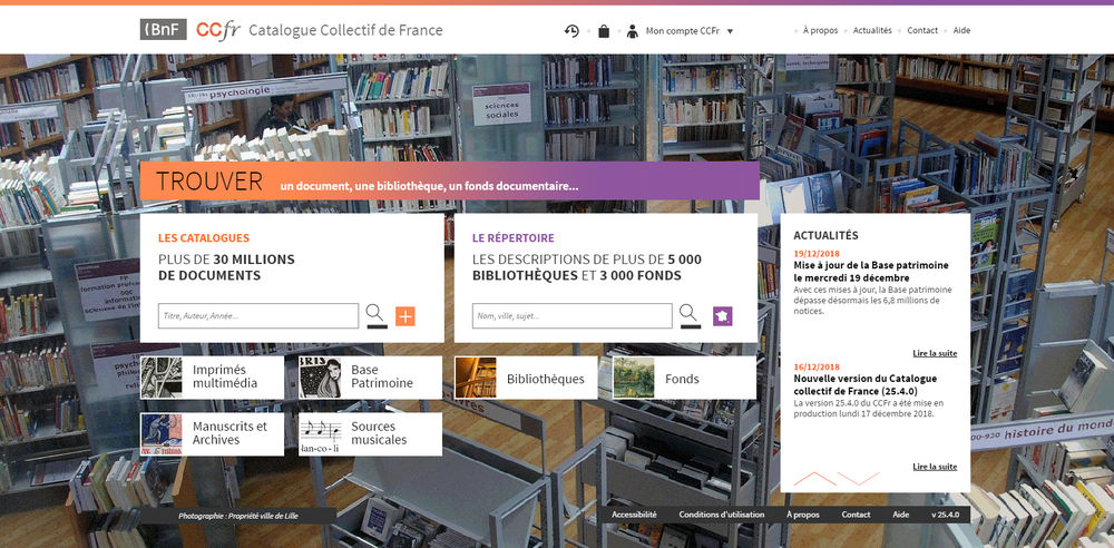 Le CCFr est l’outil de recherche bibliographique et documentaire le plus riche du domaine français, permettant l’interrogation simultanée de 10 catalogues. Il permet de localiser en France plus de 40 millions de documents imprimés et multimédia, donne accès à l’ensemble des catalogues en ligne de manuscrits et au Répertoire national des bibliothèques et des fonds documentaires.