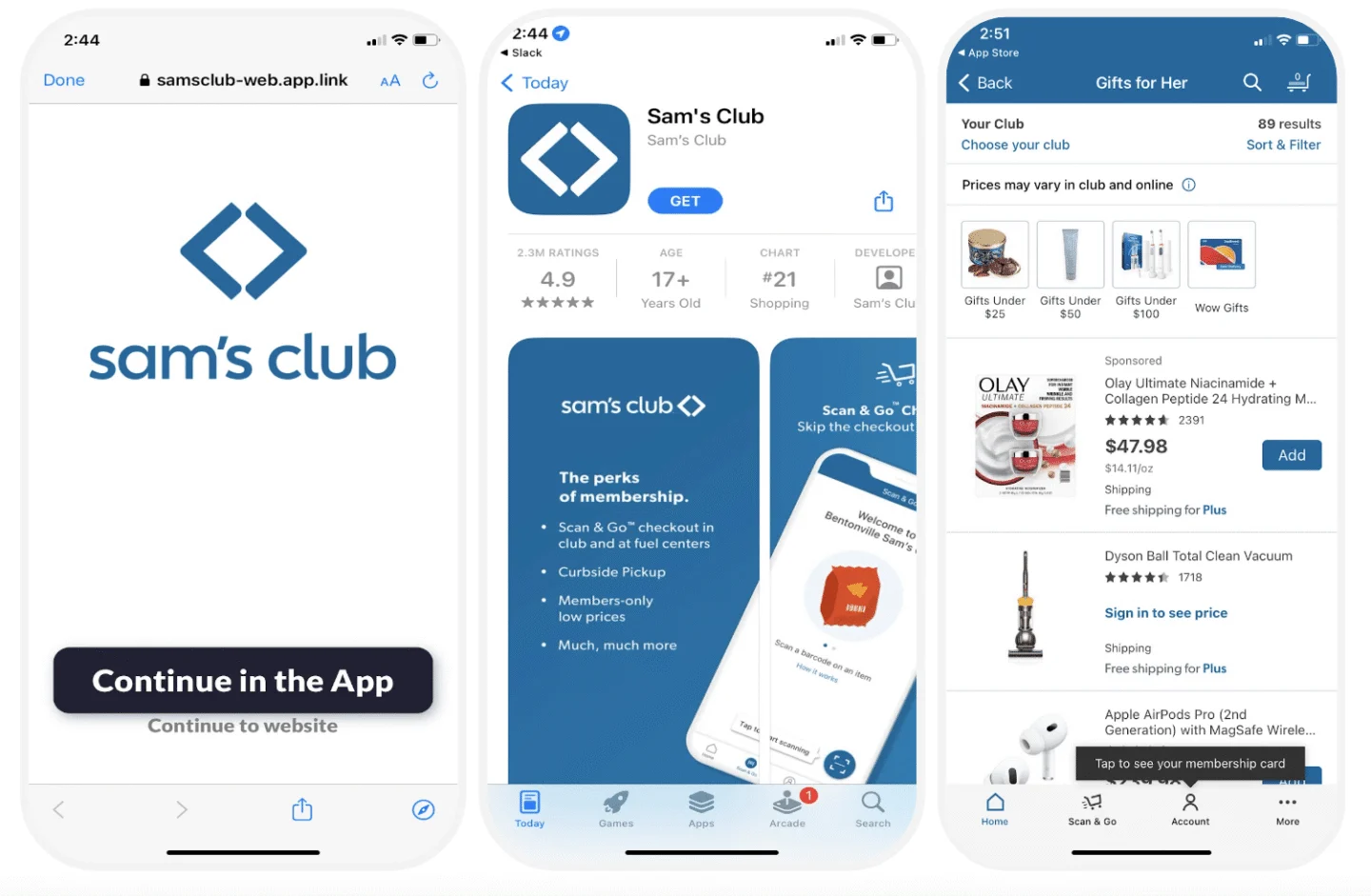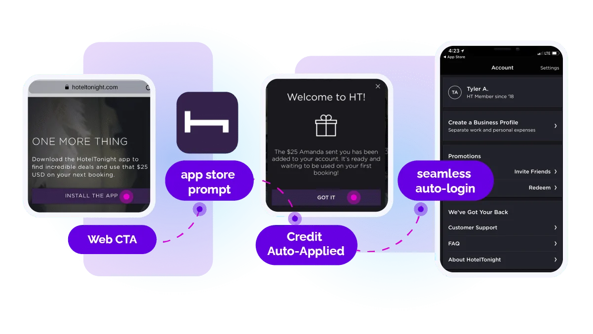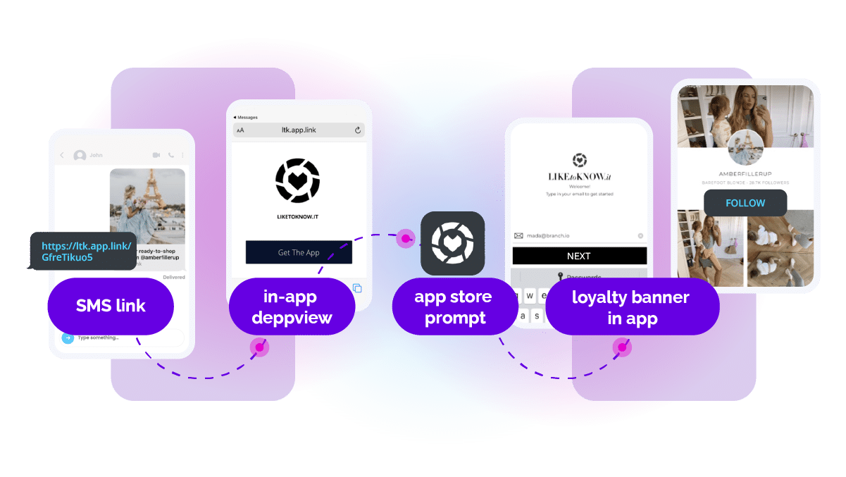 - If they don’t have the app, the link will route them to install the app and then — with context still in place — to the desired in-app content.