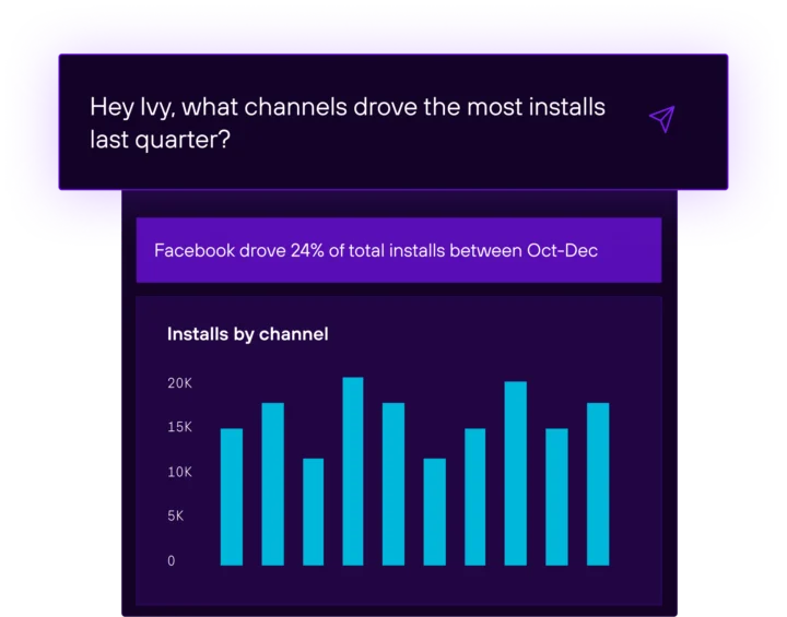 From the moment you log in, Ivy surfaces personalized, actionable recommendations. From top-performing channels to missing attribution tags, insights are tailored to your needs so you can act fast. Ivy adapts with precision to discover patterns and insights from your data that you might otherwise miss.