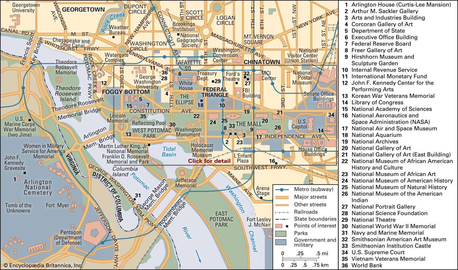 The largest of the four quadrants of the District is Northwest, which contains most of the city’s federal buildings, tourist destinations, and wealthier neighbourhoods. It encompasses the areas known as Downtown, Lafayette Square, Foggy Bottom, Georgetown, Dupont Circle, and Adams-Morgan, among others.