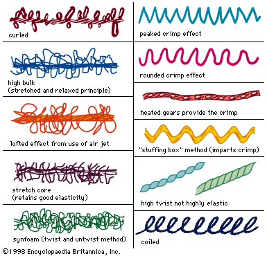 Bulking creates air spaces in the yarns, imparting absorbency and improving ventilation. Bulk is frequently introduced by crimping, imparting waviness similar to the natural crimp of wool fibre; by curling, producing curls or loops at various intervals; or by coiling, imparting stretch. Such changes are usually set by heat application, although chemical treatments are sometimes employed. In the early 1970s bulky yarns were most frequently produced by the “false twist” method, a continuous process in which the filament yarn is twisted and set and then untwisted and heated again to either stabilize or destroy the twist. The “stuffing box” method is often applied to nylon, a process in which the filament yarn is compressed in a heated tube, imparting a zigzag crimp, then slowly withdrawn. In the knit-de-knit process, a synthetic yarn is knitted, heat is applied to set the loops formed by knitting, and the yarn is then unraveled and lightly twisted, thus producing the desired texture in the completed fabric.