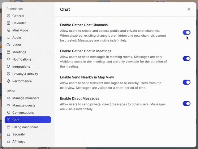 Admins now have more control over which chat types are available in your workspace. Go to Settings to enable or disable channels, meeting chat, nearby chat, and DMs.