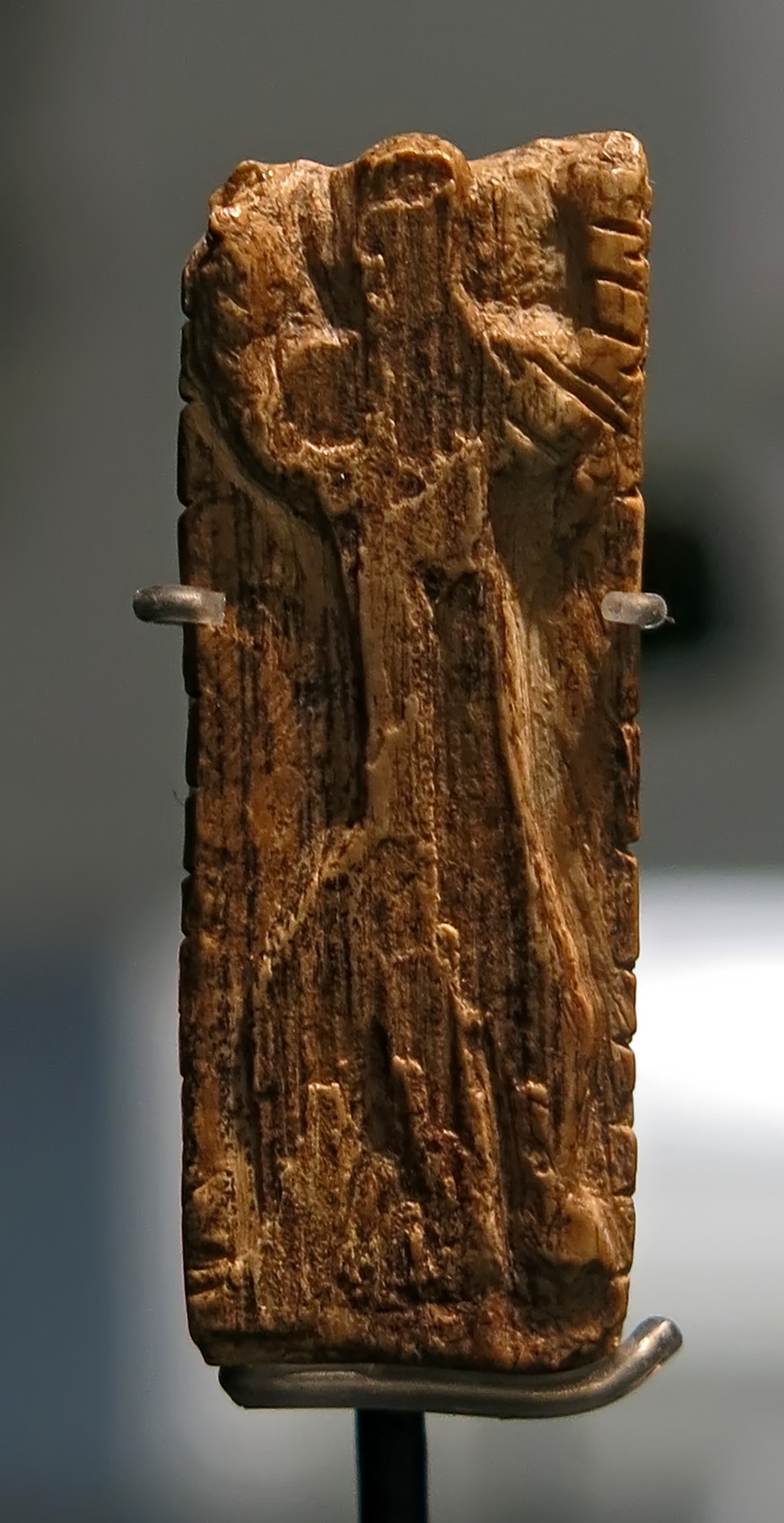 State of conservation: The object is generally well preserved. Most of the surface of the figure on side A is only weathered from its original use, although during the excavation a tiny piece (ca 1mm) of the left upper corner was broken off. The uppermost thin ivory lamination on this side was also slightly damaged during the excavation. A tiny part of side B was chipped off, and has been restored.