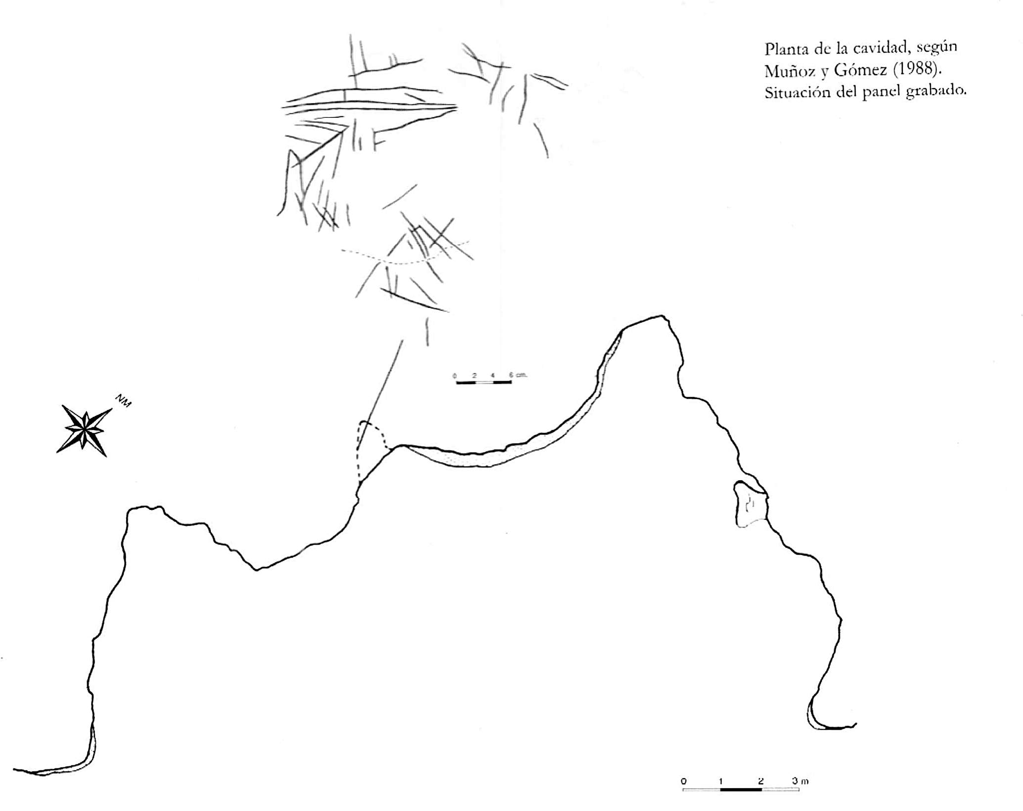 The engravings are in a small niche, high above ground level in the cave, up to 2.5 m. high, in the bottom left of the shelter, where it has been well preserved on a rock support, unlike other parts of the cave that are very degraded. The panel measures approximately 40 x 35 cm, and the engravings consist of a linear series of strokes with a deep groove "V" section using a burin, spindle-shaped. It is possible to isolate three groups of non-figurative engravings in various orientations,