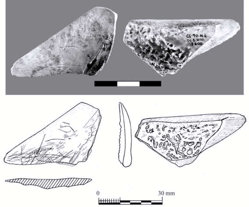 Its dimensions are 198 x 17.5 x 17.5 mm, and it comes from the basal section of the Magdalenian (level VII), dated at 13,400 ± 150 BP, at the end of older Dryas.