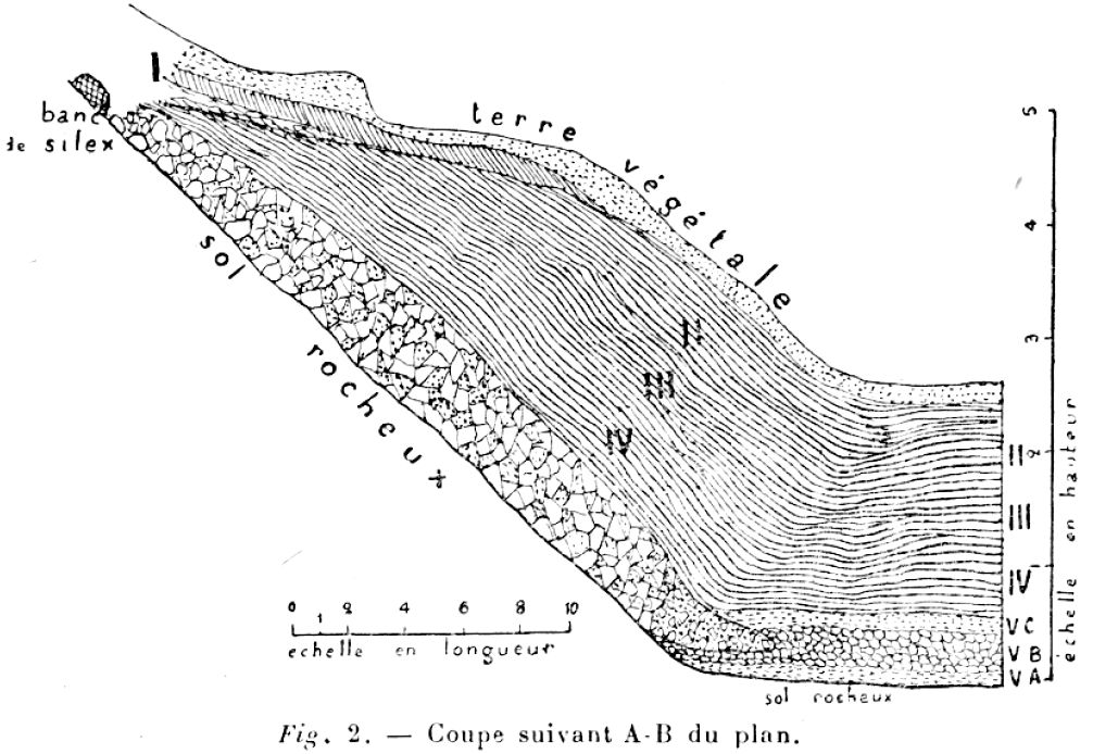 Coupe stratigraphique du gisement de Combe-Capelle fait le 01.07.1907, d'apres H. Breuil.
