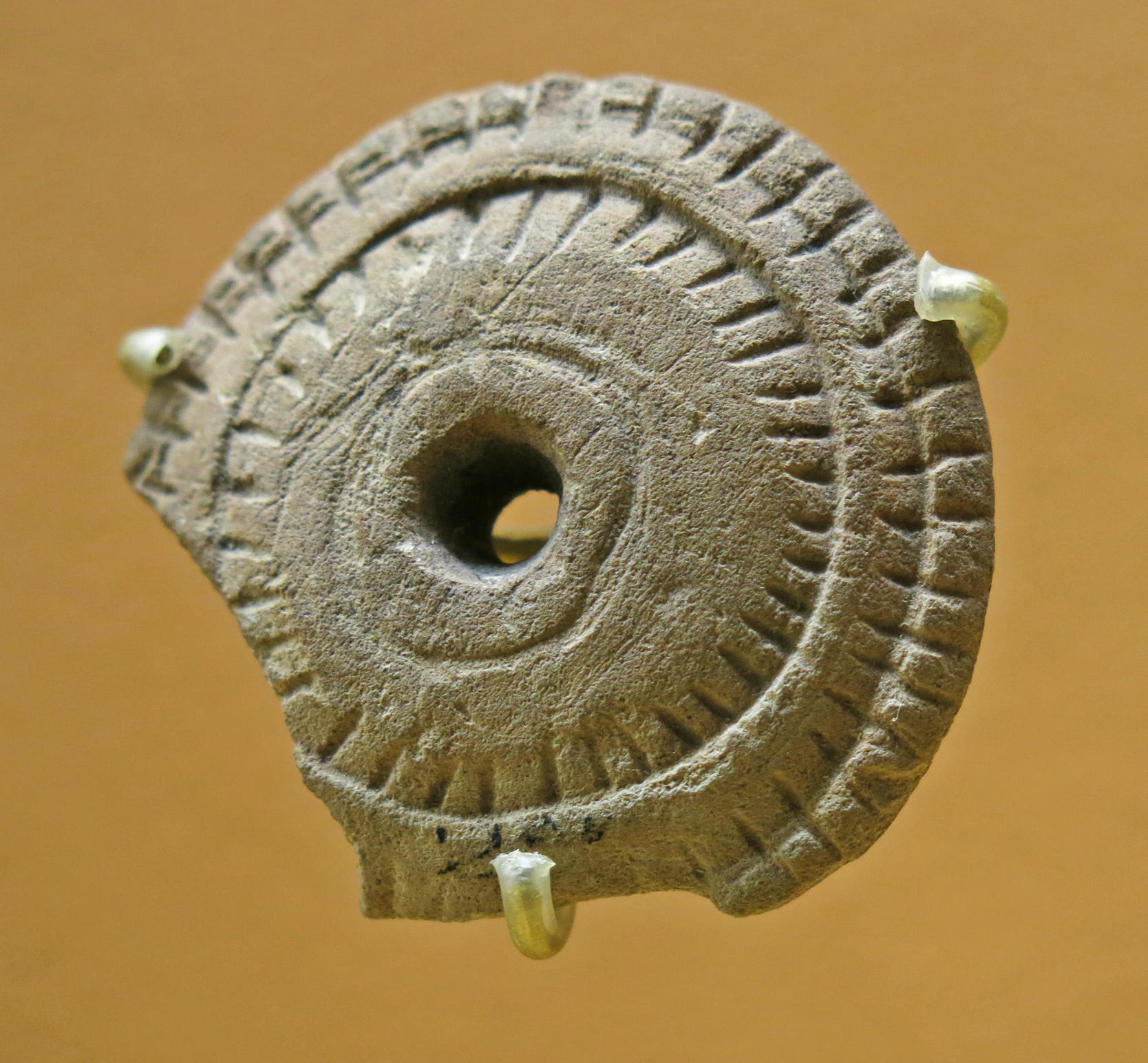On each side of the disc, an engraved line connects the perforations. The disc is decorated with two bands of engraved hatching along the diameter of both sides of the central hole. Six pairs of convergent dashes in a chevron shape are within the bands of hatching.