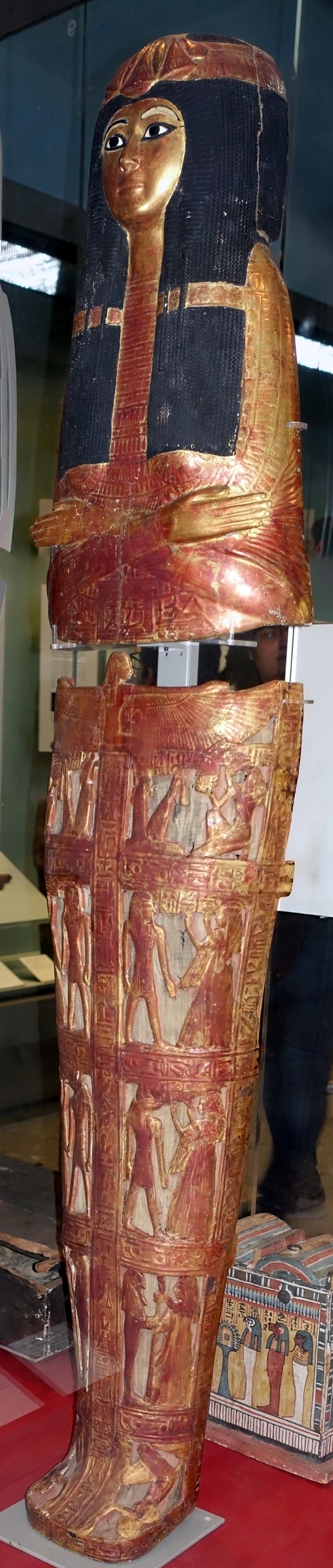 Anthropoid gessoed wood canopic-coffin; lid originally pegged to box by 4 tenons and decorated with black lappeted wig with banded diadem, broad collar, winged scarab, wedjat-eyes on breast, vertical column of text down front, ground ruled with broad chequer-board pattern in red on yellow.