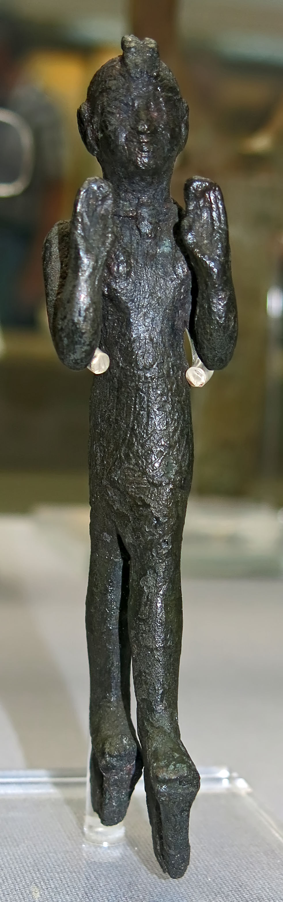 Meroitic amulet of cast gold, long-eared, long-tailed animal identified as a canine but with hooves. The suspension loops are on the left side, two on the body, and two on the base, said to be from Cyrene.