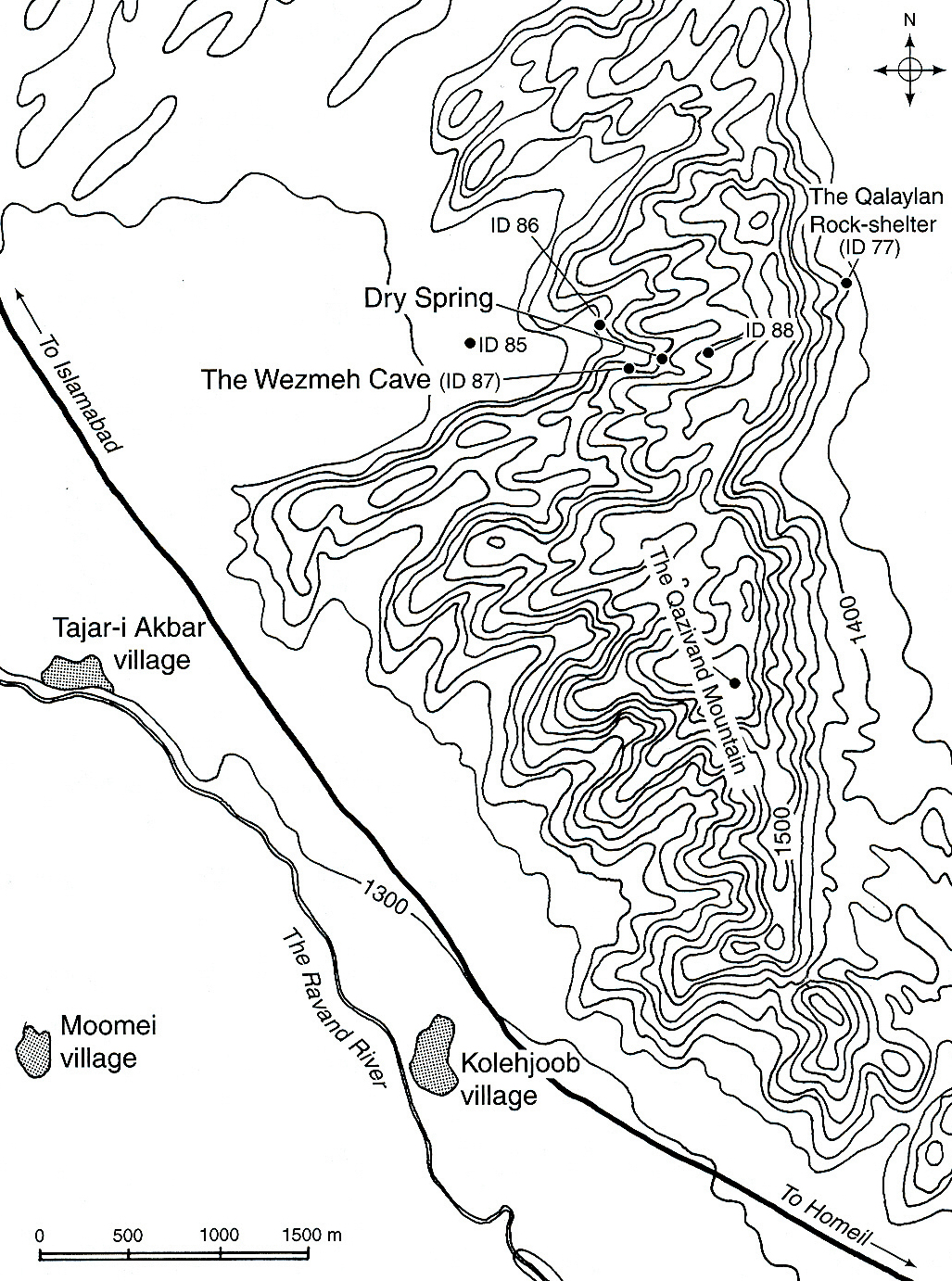 Qazivand is the southwest side of an unroofed (eroded) anticline, reaching a maximum height of 1558 m a.s.1. on a north-south axis, overlooking to the east the Shiyan and to the west the Islamabad Plains. Wezmeh Cave is located at an elevation of 1430 m a.s.1. about 60 m above the valley floor on a steep slope with a dip of 36°. The mouth of the cave faces north and is 2m wide and 1.2 m high.