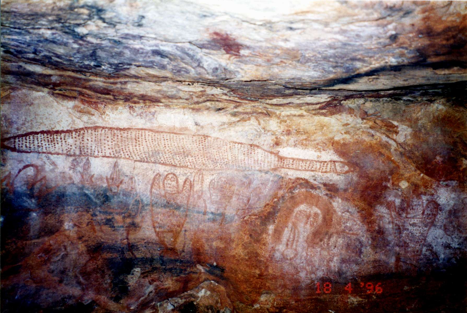 The main figures seem to have been painted over the top of previous art works. There may be a goanna painted vertically on the lower right of this image.