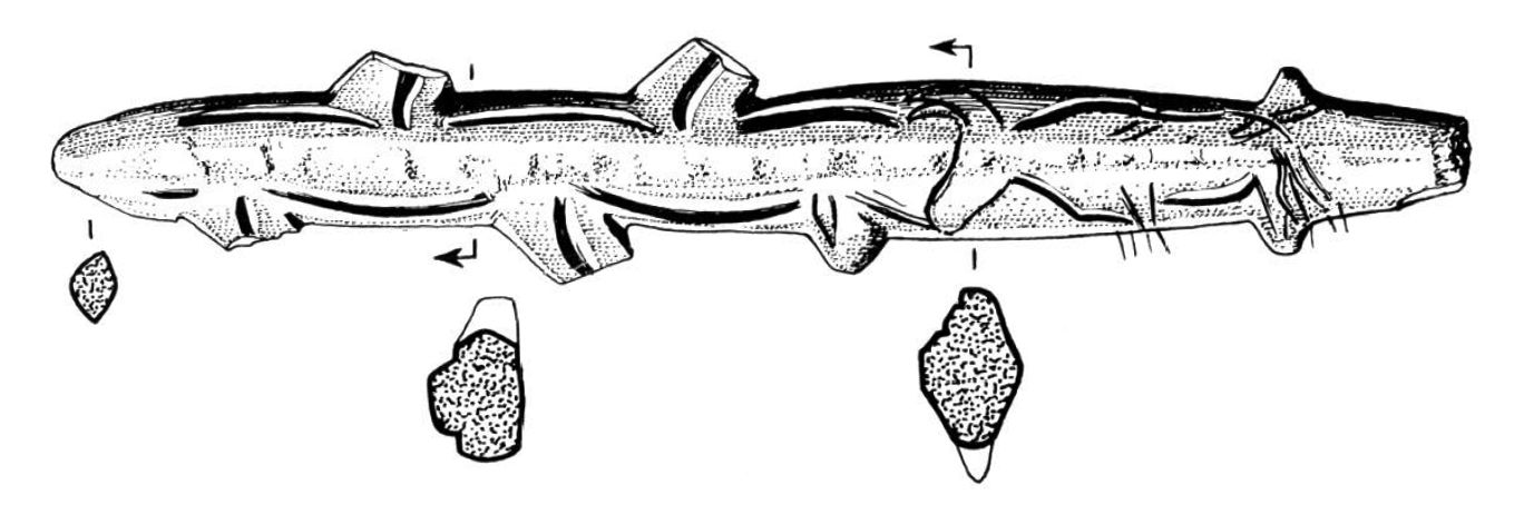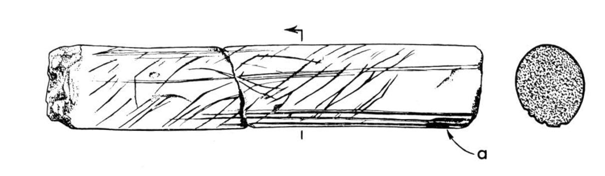 On the underside is a deep incision on the axial shaft and bevel. On the upper face, c, two light lines intersecting. On the flank b, on a flat section carved from the round a deep etching of a longitudinal rod, with five spread out oblique lines on the left and eight oblique lines closer together on the right; at the top, a longitudinal incision. This figure can be interpreted as a barbed arrow or as bilateral barbs on a spear.