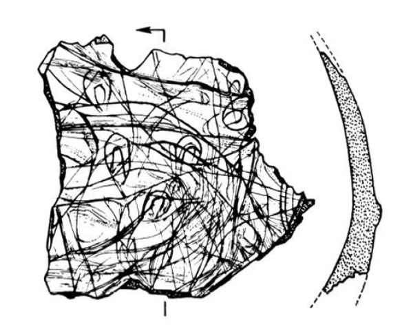 Skull bone fragment. Length 66 mm, width 56 mm. A tangle of lines covers both sides of the piece. On the concave face are six figures shaped like horseshoes, arranged in no apparent order. They are comparable to the signs engraved on stone blocks of various Perigord shelters, which are conventionally interpreted as vulvas, including an oval sign of the Aurignacian II from la Ferrassie. However, in general, the Aurignacian vulvas are not oval but more or less triangular. (see below - Don )